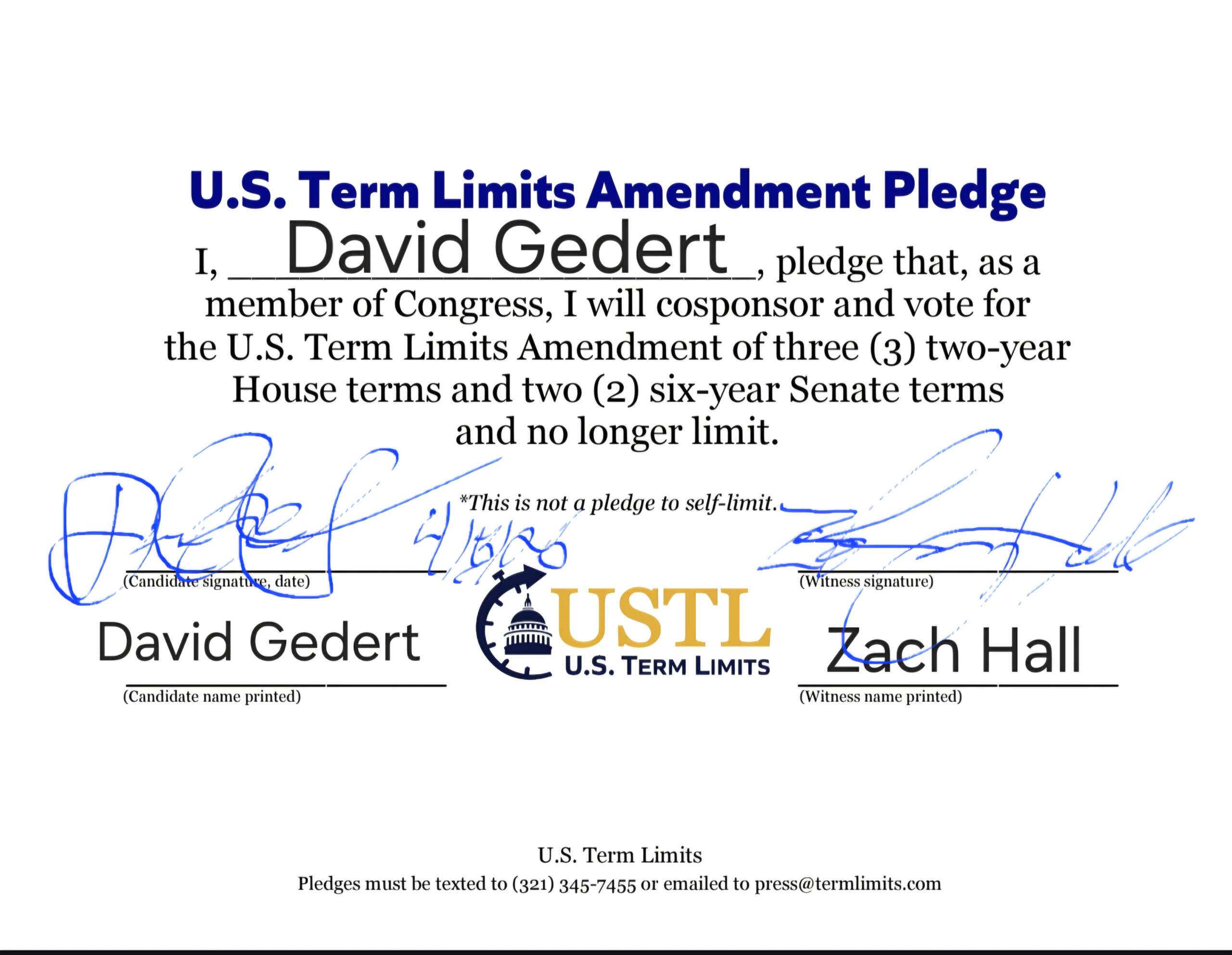 The U.S. Term Limits amendment pledge is provided to every announced candidate for federal office. It reads, “I pledge that as a member of Congress, I will cosponsor and vote for the U.S. Term Limits amendment of three (3) two-year House terms and two (2) six-year Senate terms and no longer limit.”