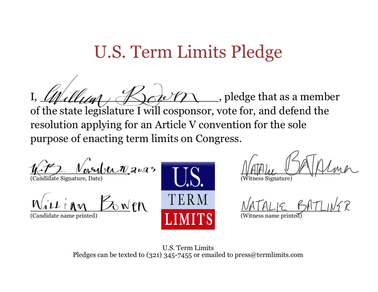USTL President, Philip Blumel, commented on Bowen’s pledge saying, “William’s strong support of term limits shows that there are individuals who are willing to listen to the majority of voters who want term limits. America needs a Congress that will be served by citizen legislators, not career politicians.”