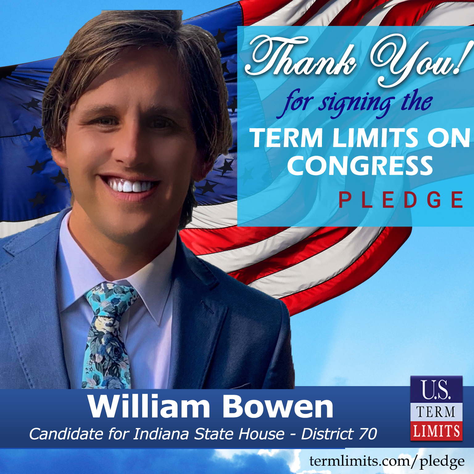 Corydon, IN – U.S. Term Limits (USTL), the leader in the national, non-partisan movement to limit terms for elected officials, is gathering support from state lawmakers across the nation. Its mission is to get 34 states to apply for an amendment proposal convention specific to term limits on Congress. Indiana state house candidate, William Bowen (District 70), has committed support for term limits on Congress by signing the Term Limits Convention Pledge. Bowen is the first signer in this race.