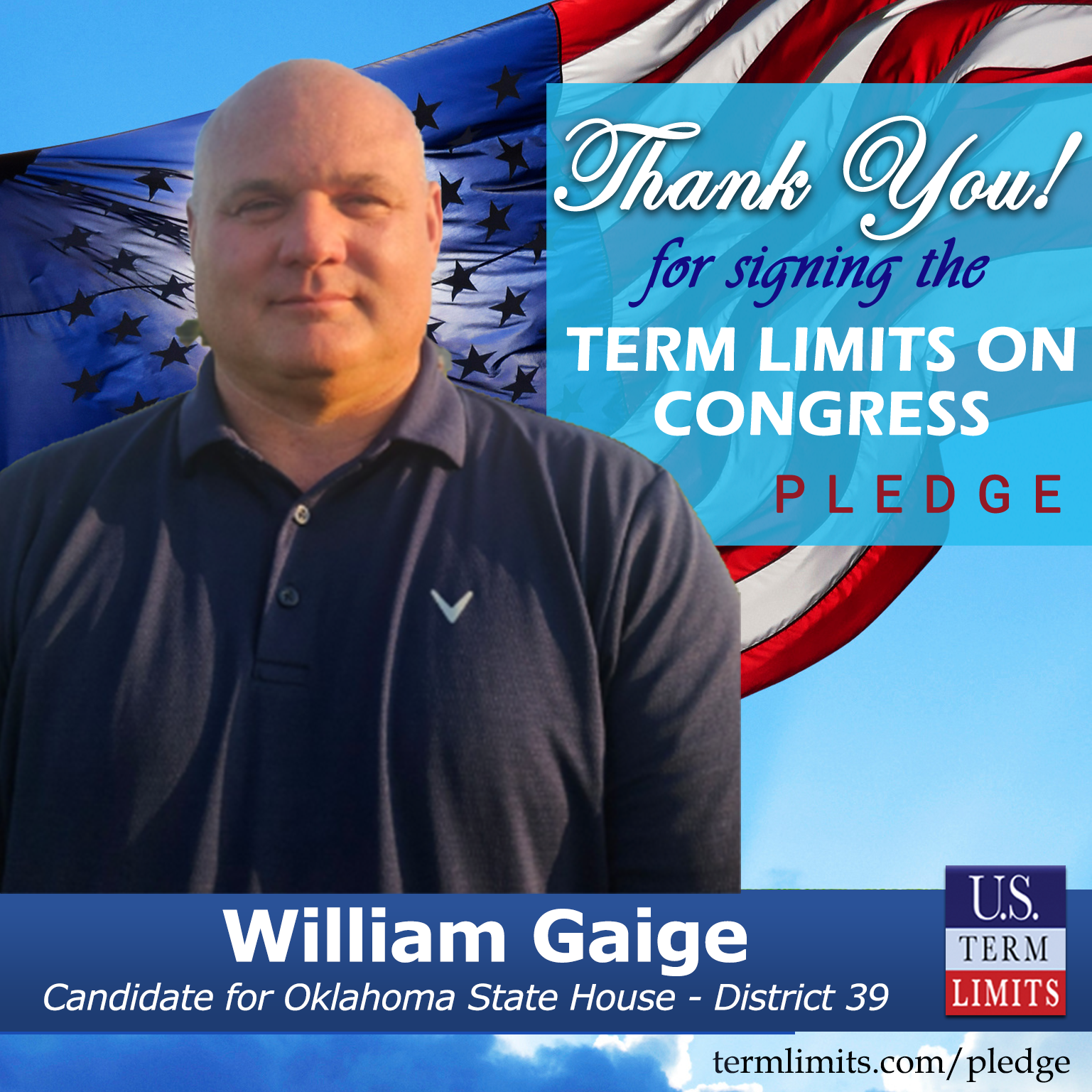 Oklahoma City, OK – U.S. Term Limits (USTL), the leader in the national, non-partisan movement to limit terms for elected officials, is gathering support from state lawmakers across the nation. Its mission is to get 34 states to apply for an amendment proposal convention specific to term limits on Congress. Oklahoma state house candidate, William Gaige (District 39), has committed support for term limits on Congress by signing the Term Limits Convention pledge. Previously, candidates Timothy Hale, Ronda Peterson and Erick Harris also signed the pledge. The special election is scheduled for December 12, 2023.
