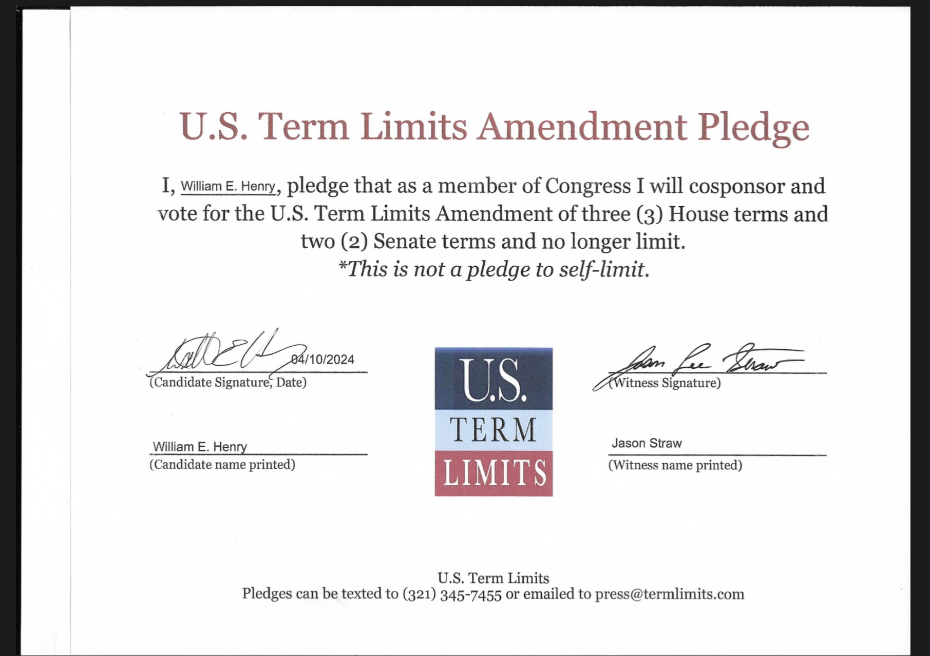 U.S. Term Limits has the support of more than 130 pledge signers in Congress. USTL President Philip Blumel commented on Henry’s pledge saying, “William’s strong support of term limits shows that there are individuals who are willing to put self-interest aside to follow the will of the people. America needs a Congress that will be served by citizen legislators, not career politicians.”