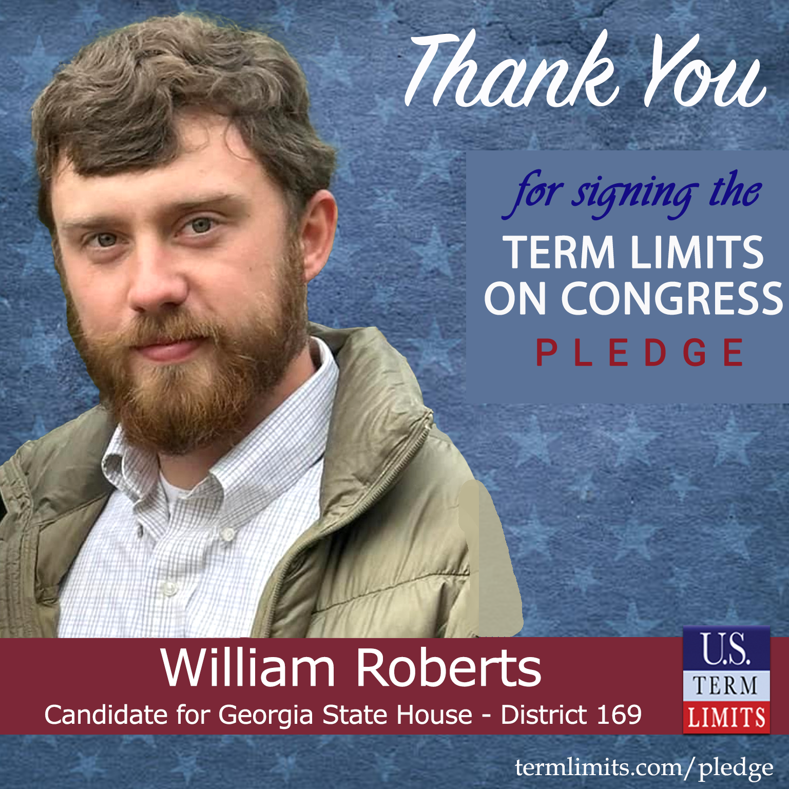 Ashburn, GA – U.S. Term Limits (USTL), the leader in the national, non-partisan movement to limit terms for elected officials, is gathering support from state lawmakers across the nation. Its mission is to get 34 states to apply for an amendment proposal convention specific to term limits on Congress. Georgia state house candidate, William Roberts (District 169), has committed support for term limits on Congress by signing the term limits convention pledge. Roberts is the first signer in this race.