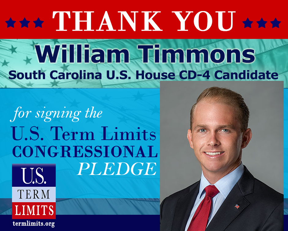 Washington, D.C. – U.S. Term Limits (USTL), the leader in the national movement to limit terms for elected officials, today praised South Carolina U.S. House CD-4 candidate, William Timmons, for signing its congressional term limits pledge. Recently, another candidate, Daniel Hamilton also committed his support to proposing term limits on Congress. This seat is being vacated by Trey Gowdy who has also signed the term limits pledge and has scored an A rating on the USTL Legislator Scorecard.
