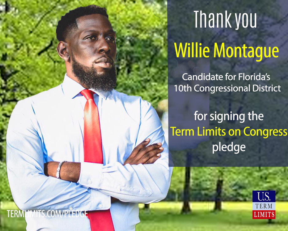 Gainesville, Florida – U.S. Term Limits (USTL), the leader in the non-partisan national movement to limit terms for elected officials, praises 2020 U.S. House candidate for Florida, Willie Montague (district 10), for signing the pledge for an amendment to term limit Congress. Montague is the first signer in this race. The primary election for FL CD-10 is scheduled for August 18, 2020.