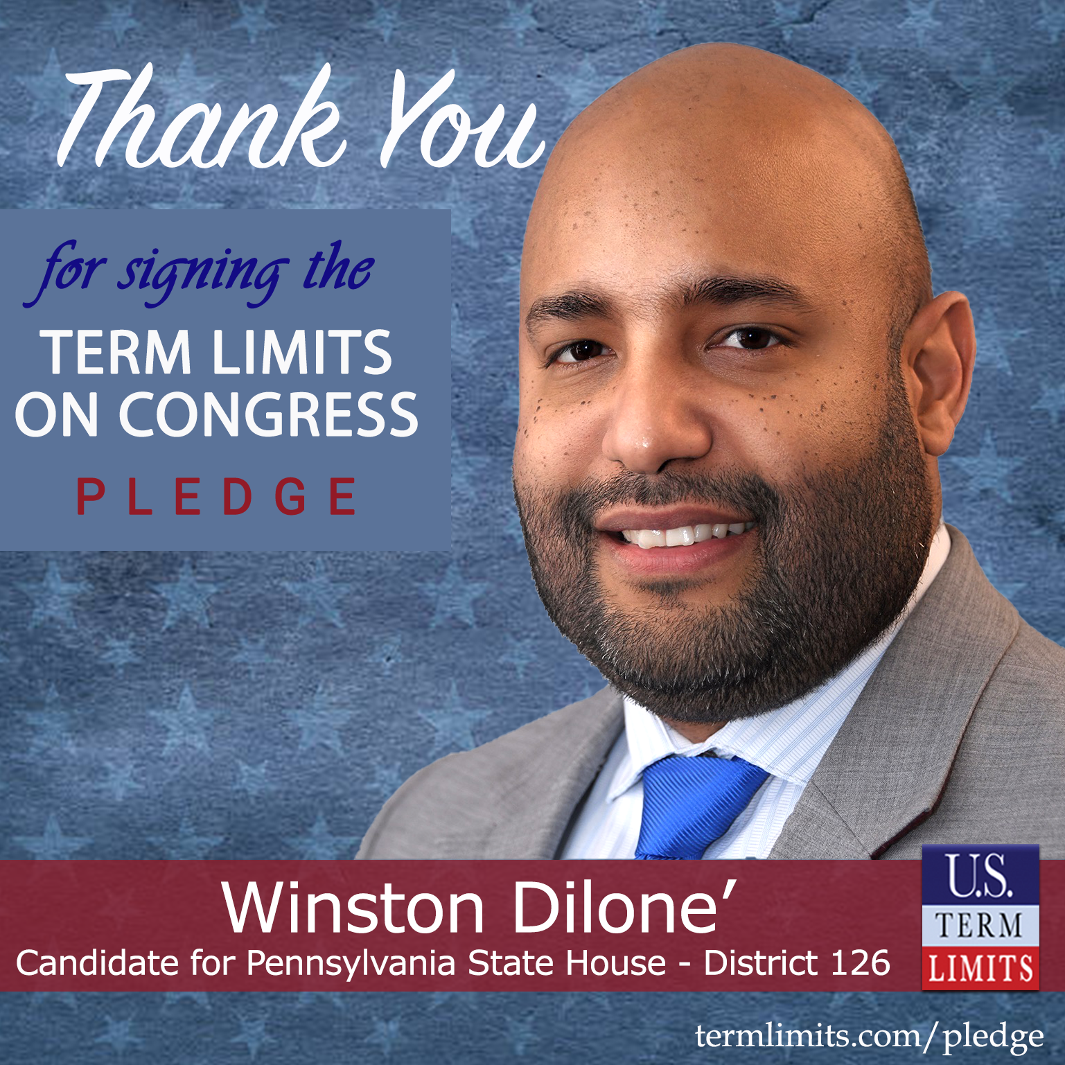 Temple, PA – U.S. Term Limits (USTL), the leader in the national, non-partisan movement to limit terms for elected officials, is gathering support from state lawmakers across the nation. Its mission is to get 34 states to apply for an amendment proposal convention specific to term limits on Congress. Pennsylvania state house candidate, Winston Diloné (District 126), has committed support for term limits on Congress by signing the term limits convention pledge. Diloné is the first signer in this race.