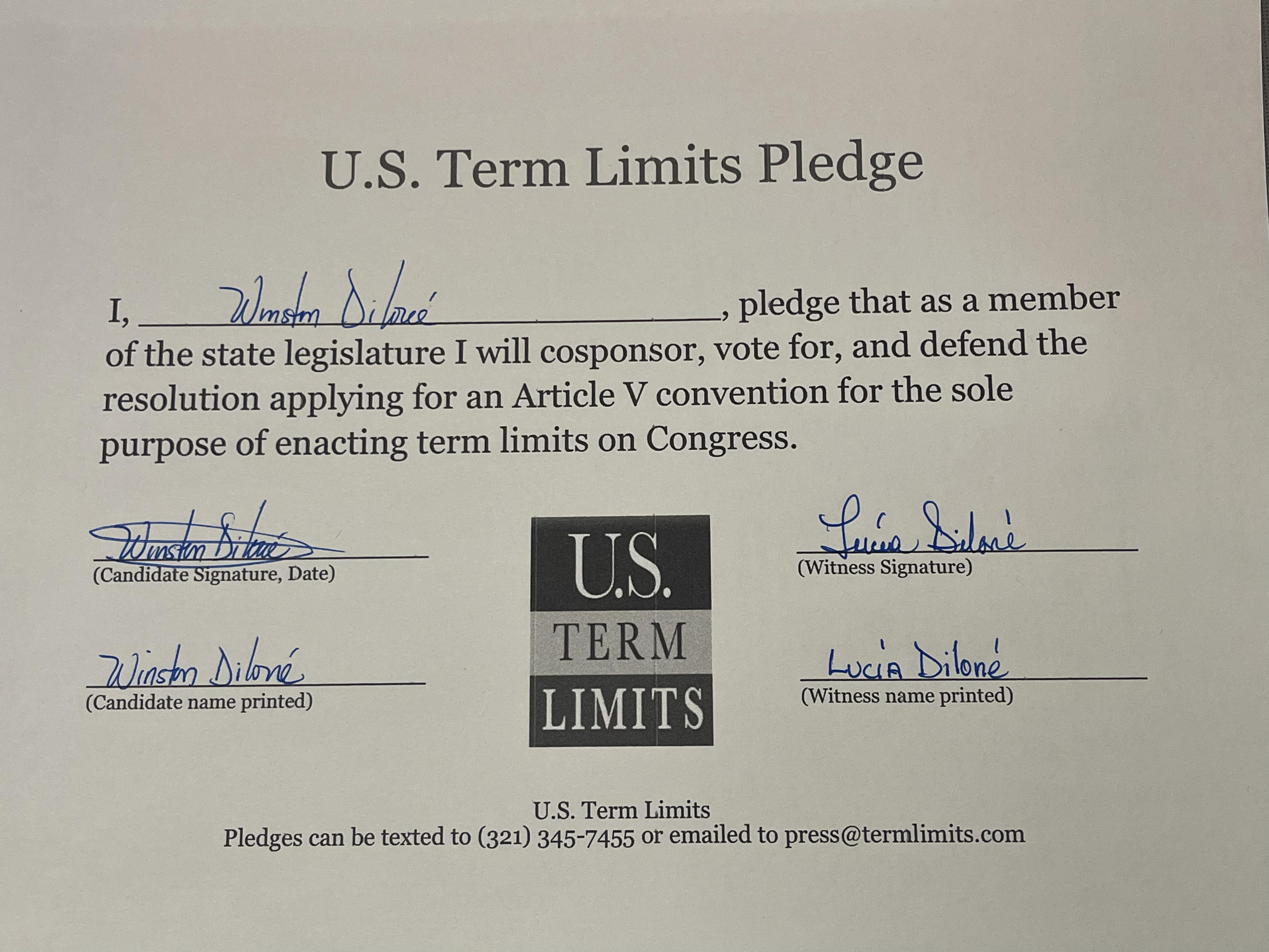 USTL President, Philip Blumel, commented on Diloné’s pledge saying, “Winston’s strong support of term limits shows that there are individuals who are willing to listen to the majority of voters who want term limits. America needs a Congress that will be served by citizen legislators, not career politicians.”
