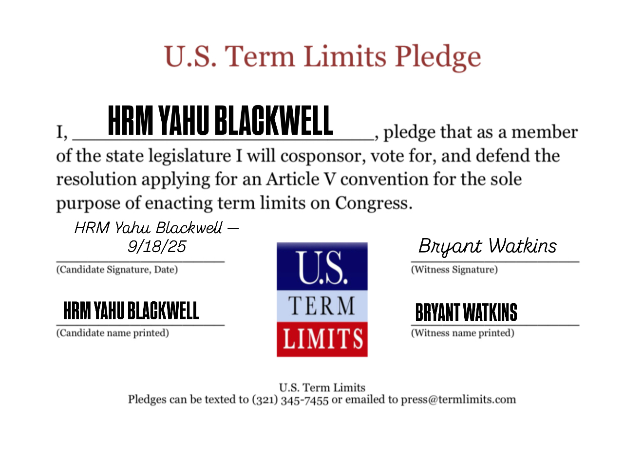 Yahu Blackwell Pledges to Support Congressional Term Limits