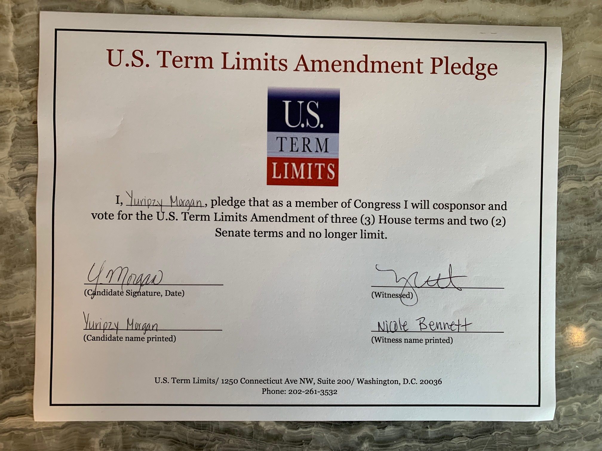 Washington D.C. – U.S. Term Limits (USTL), the leader in the non-partisan national movement to limit terms for elected officials, praises 2022 U.S. house candidate for Maryland (district 3), Yuripzy Morgan, for signing the pledge for an amendment to term limit Congress. Previously, candidates Antonio Pitocco and Amal Torres also signed the pledge.