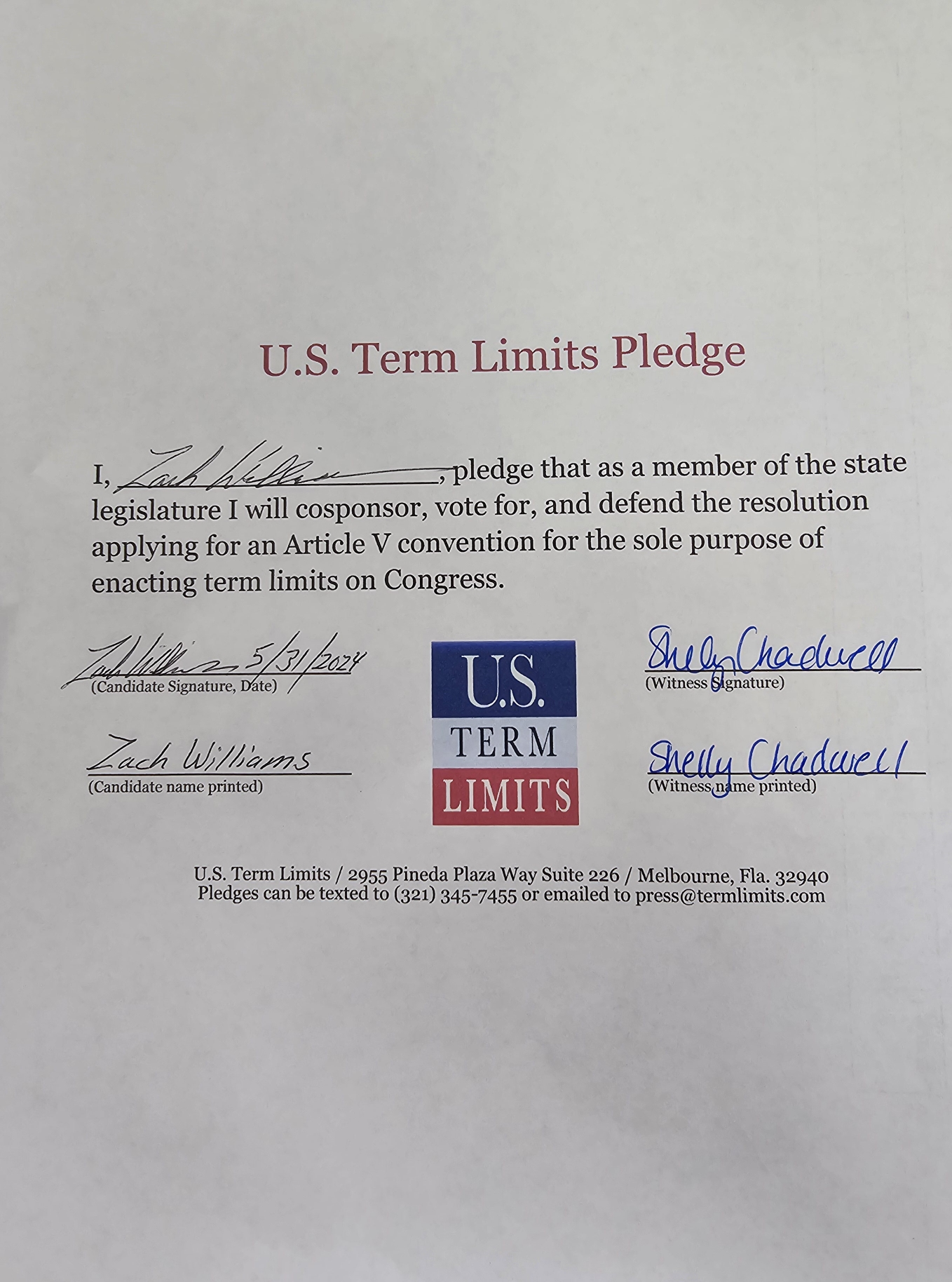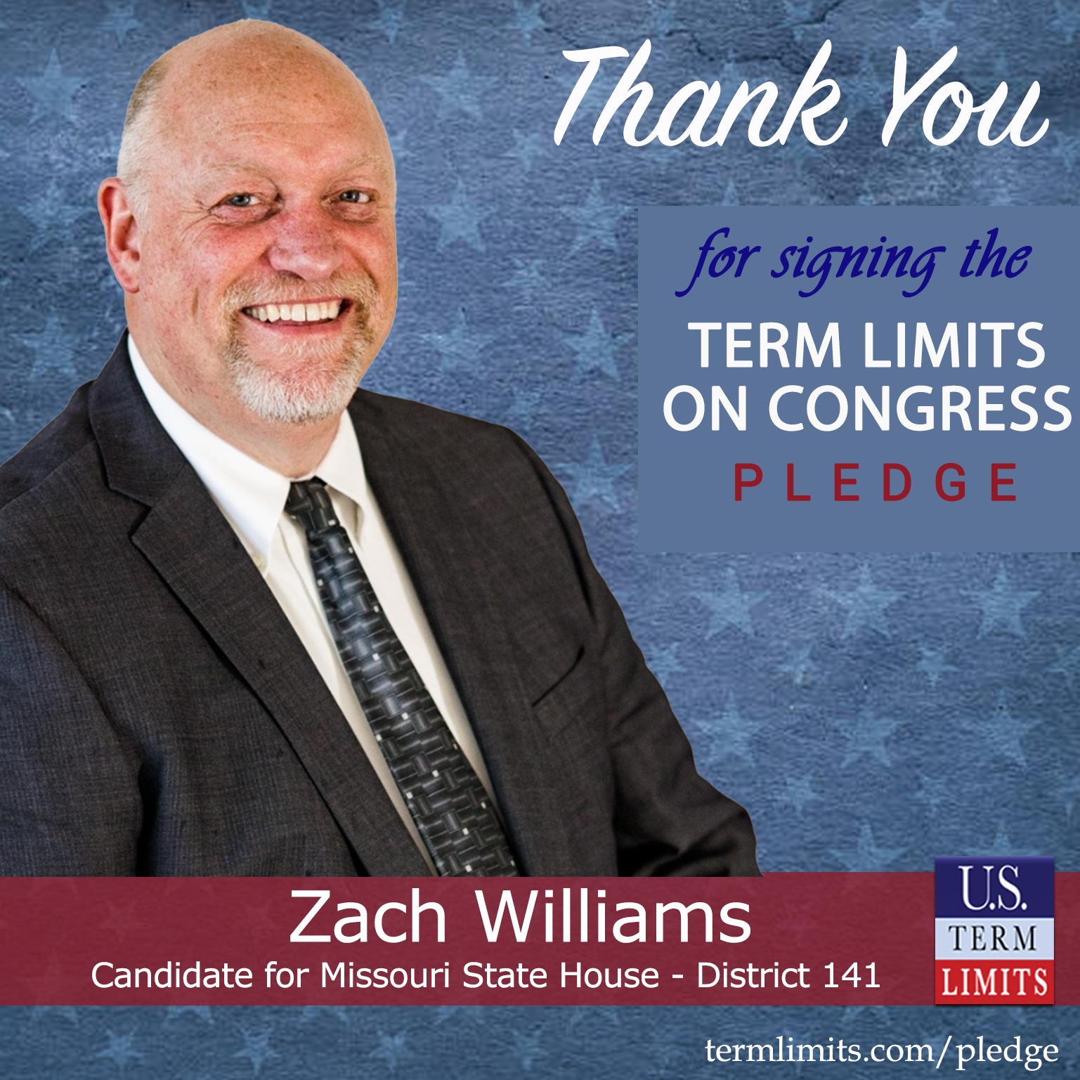 USTL President, Philip Blumel, commented on Williams’s pledge saying, “Zach’s strong support of term limits shows that there are individuals who are willing to listen to the majority of voters who want term limits. America needs a Congress that will be served by citizen legislators, not career politicians.”