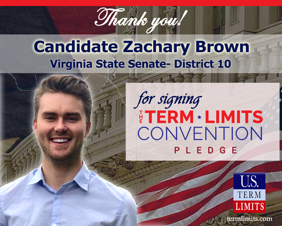 Washington, D.C. – U.S. Term Limits (USTL), the leader in the national, non-partisan movement to limit terms for elected officials, is gathering support from state lawmakers across the nation. Its mission is to get 34 states to apply for an amendment proposal convention specific to term limits on Congress. Virginia state senate candidate Zachary Brown(district 10) committed support for term limits on Congress by signing the term limits convention pledge.