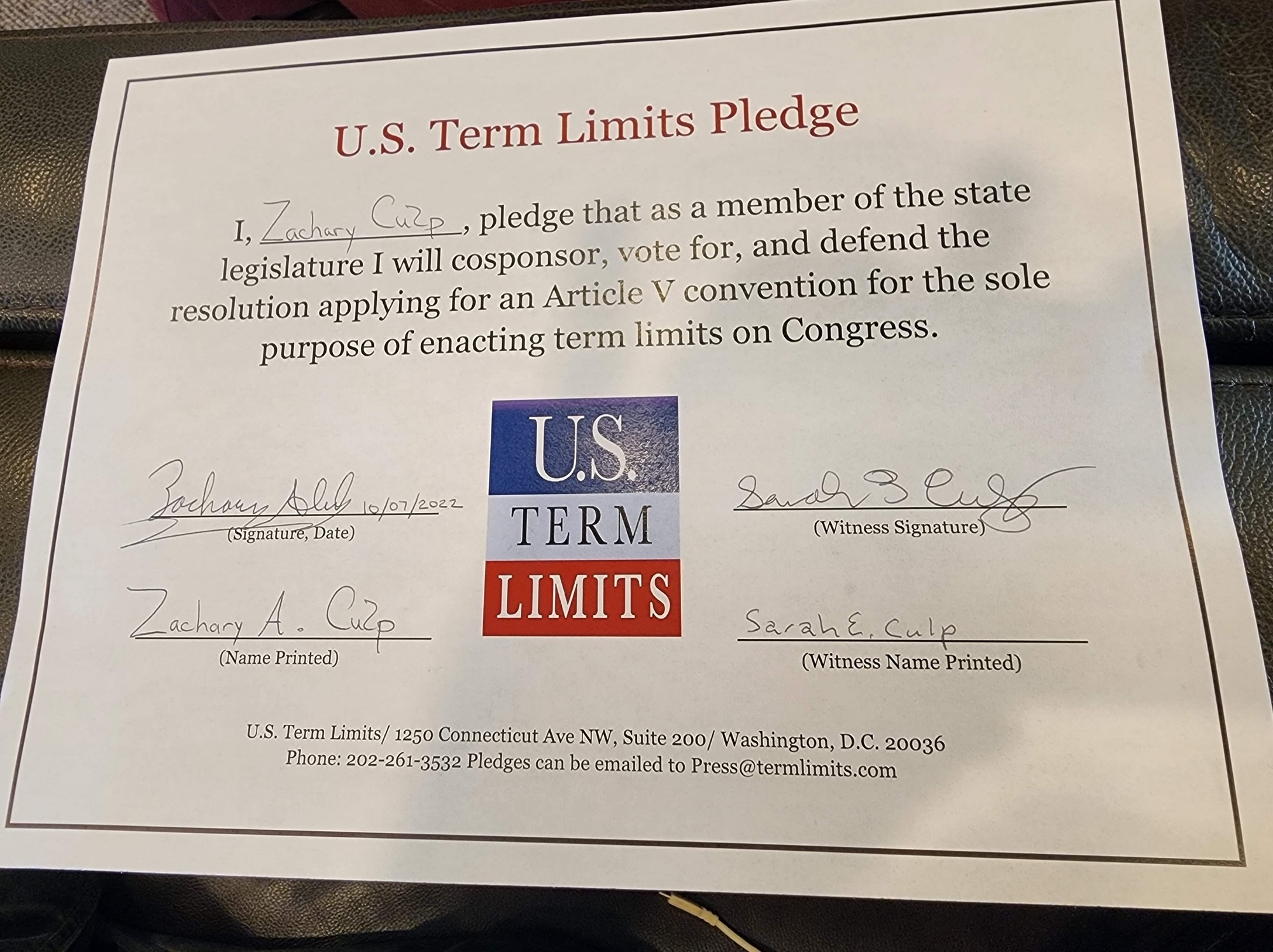 Zachary Culp Pledges to Support Congressional Term Limits