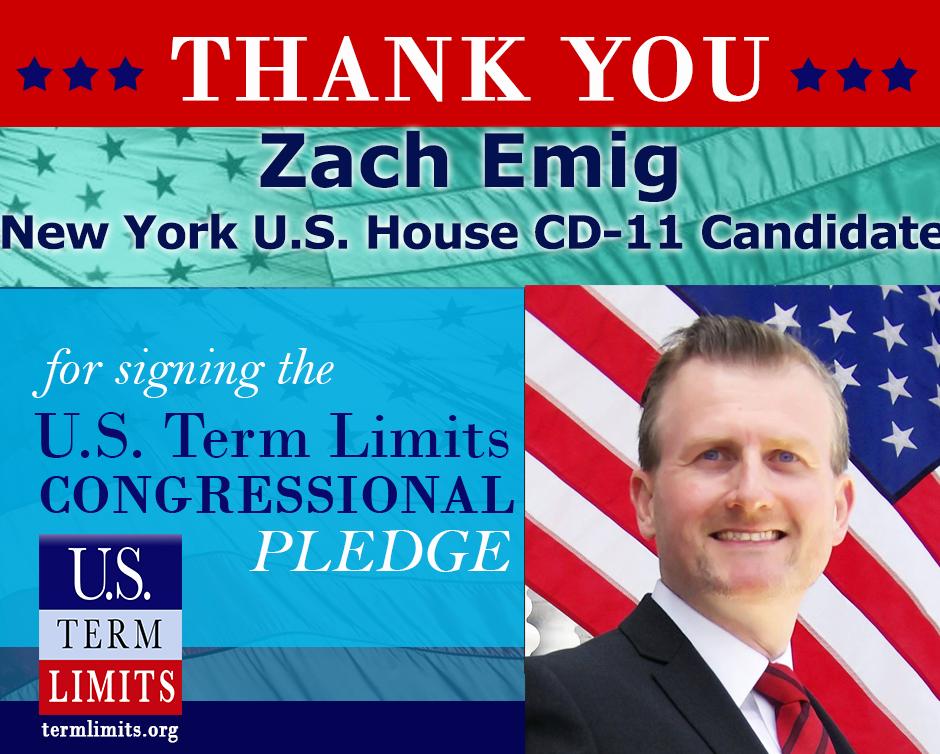 Washington, D.C. – U.S. Term Limits (USTL), the leader in the national movement to limit terms for elected officials, today praised New York candidate for U.S. House CD-11, Zach Emig, for signing its congressional term limits pledge. Previously, candidates Michael Grimm and Michael DeVito Jr. signed the pledge as well.